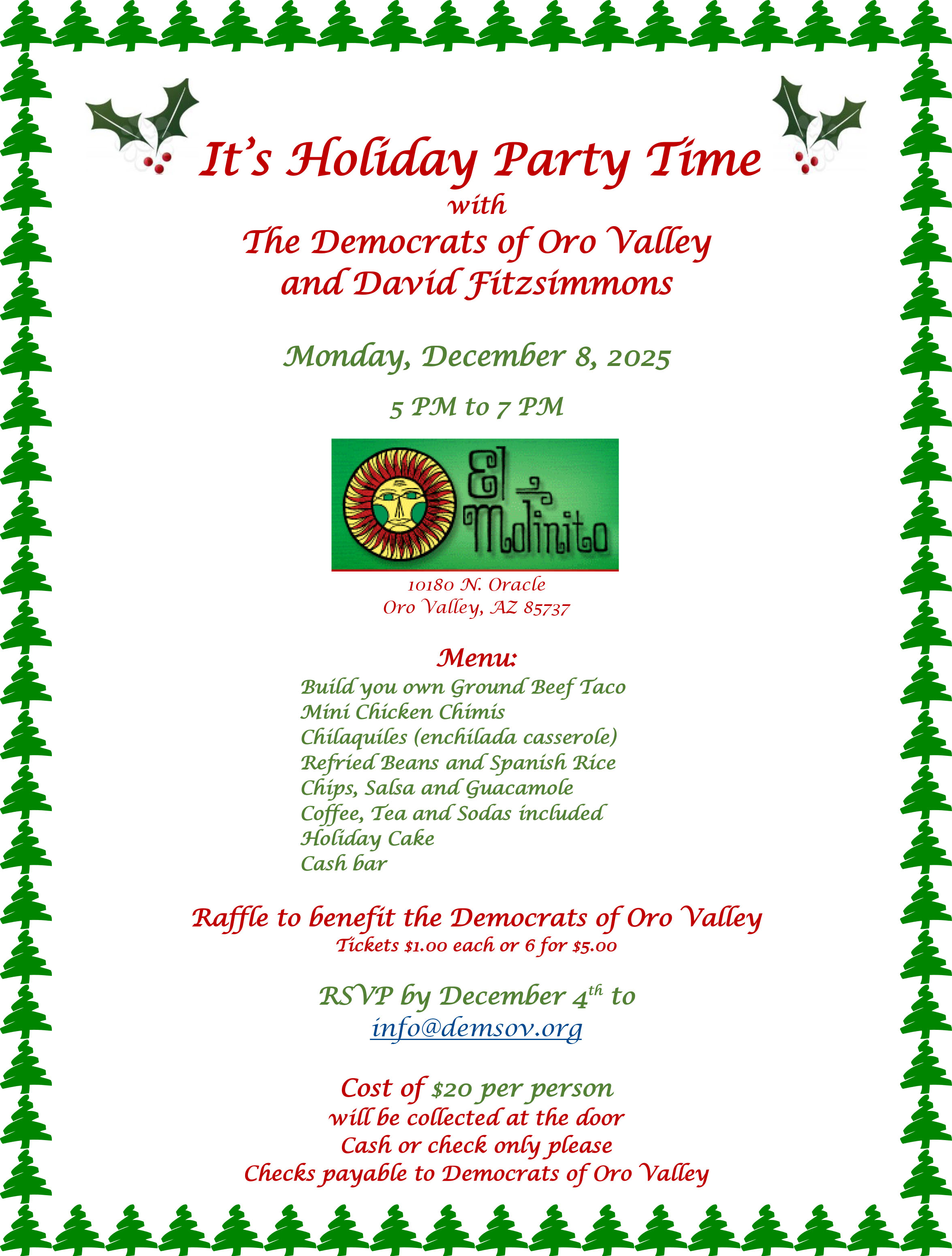 $20.00 at the door includes the El Molinito Dinner buffet plus a delicious holiday cake!